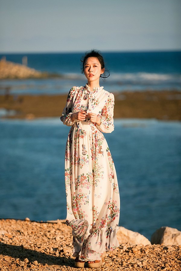 钟楚曦春日印花长裙写真:自然之境中的时尚诗篇