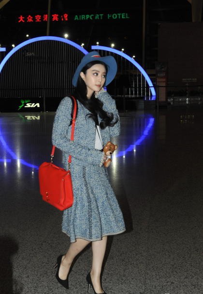 范冰冰灰蓝套装优雅现身机场 启程戛纳再现时尚影响力