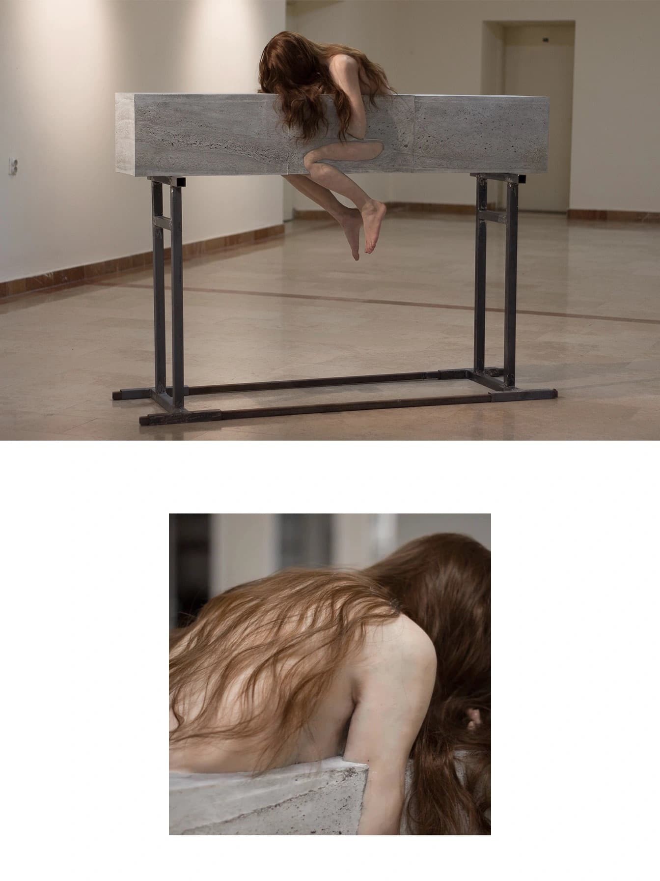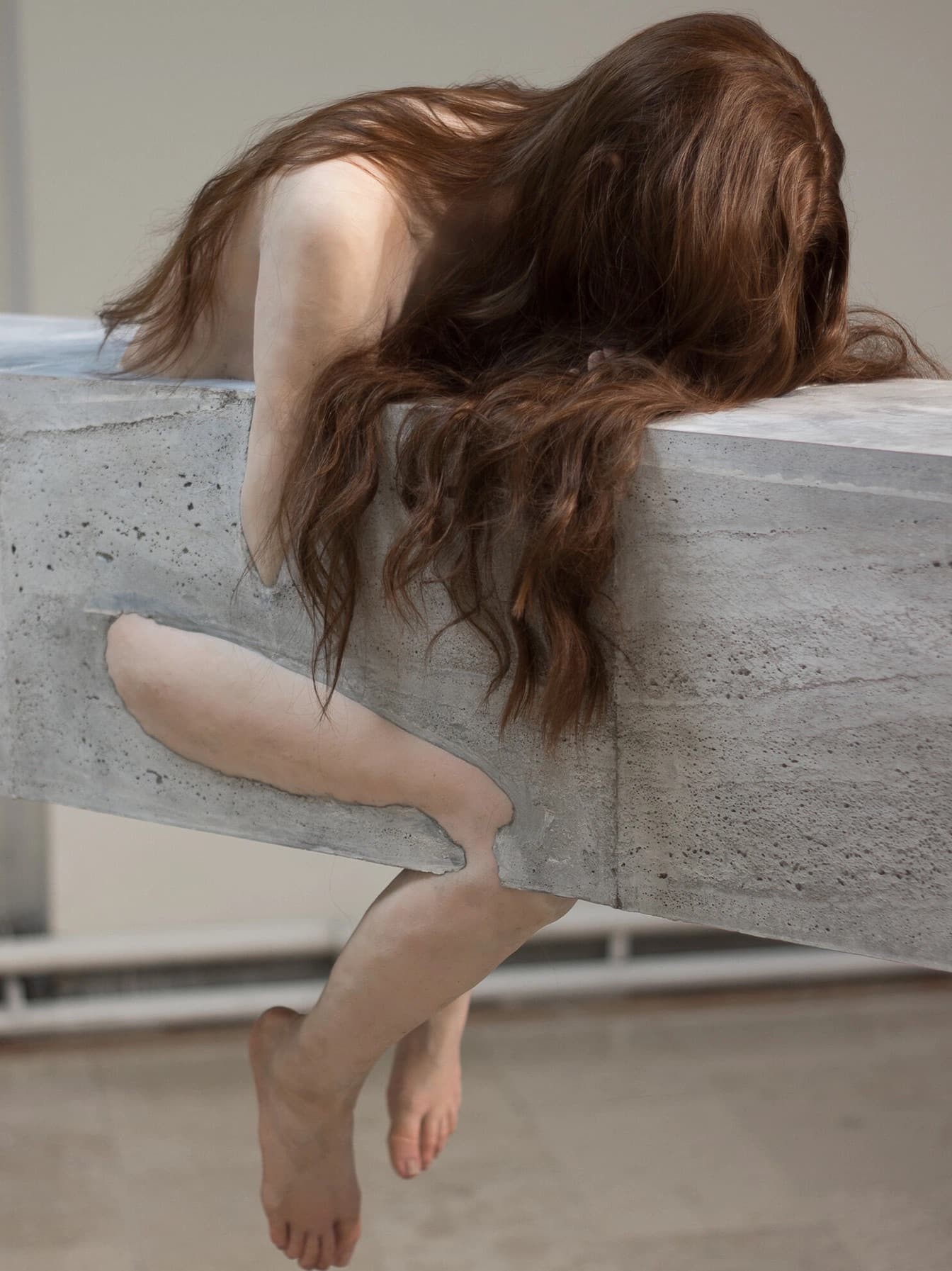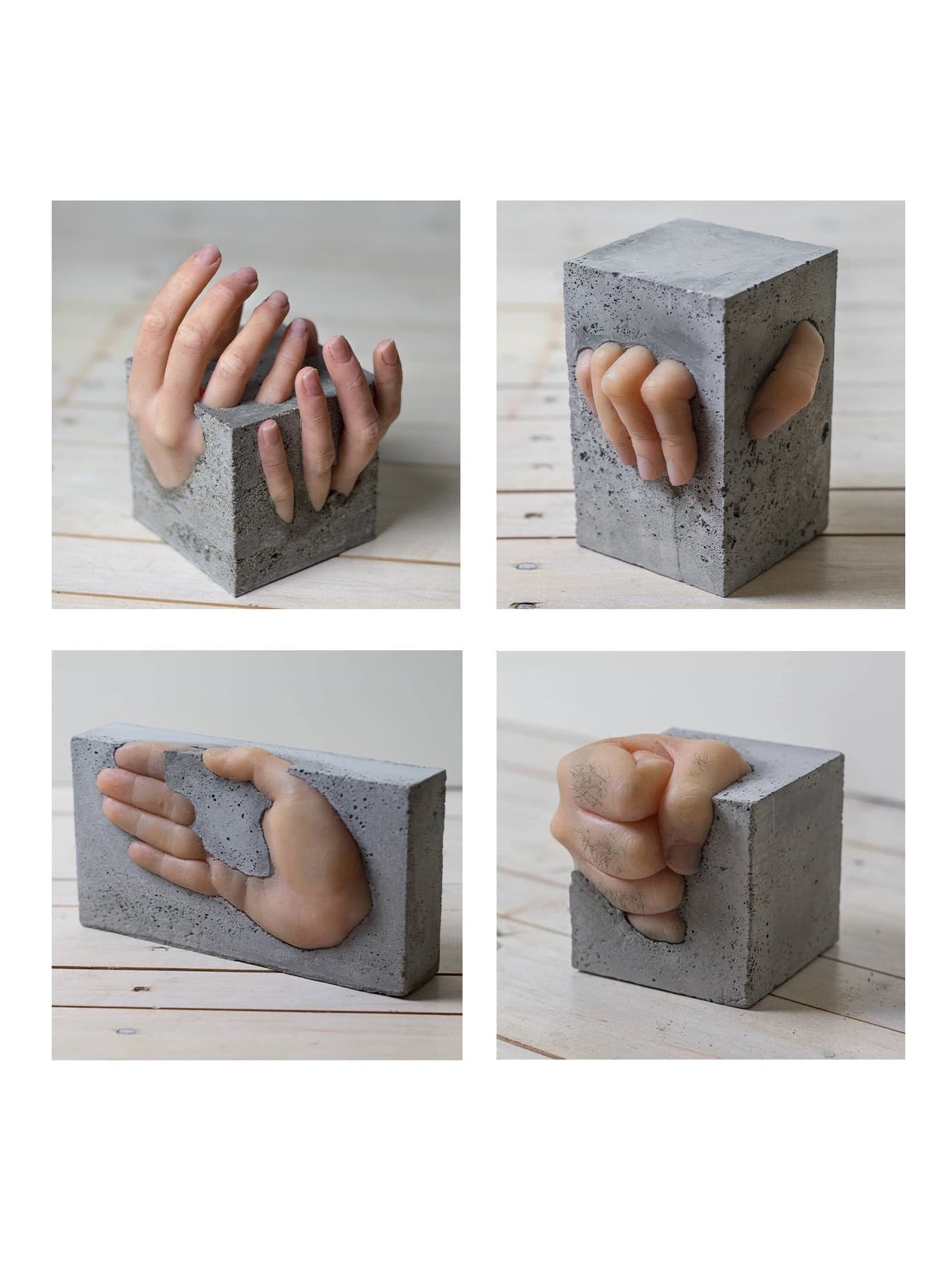 坚硬与柔软的悖论融合。瑙莫维奇的艺术核心,聚焦于“人与身体的关系”。他通过水泥这一工业化、永恒性的材料,与短暂、有机的人体形态并置,创造出强烈的视觉与概念张力。在他的作品中,我们能看到一只手臂从粗糙的水泥断面中无力地垂下,也能看见仿佛在混凝土中挣扎求生的躯干轮廓。这种处理手法,使得作品游走于“吸引人的美与令人不适的怪异”之间。艺术家有意避免明确的符号学或修辞学指向,而是通过这种极端的形态对比,邀请观众直面身体作为“存在”本身的最原始状态。身体不再是承载身份或情感的符号,而是被剥离了社会语境,还原为一种被困于无形重压下的纯粹物体,引发人们对于禁锢、自由、脆弱与永恒的思考。
