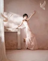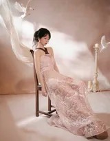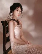 妆发造型更是将这份雅韵推至极致。半扎的高颅顶盘发不仅提升了整体造型的轻盈感,更衬出古典的端庄气质;几缕随意垂落的卷发则平添了灵动与生机。清透的妆容着重于突出肌肤自然通透的质感,一抹温柔的豆沙色唇彩与整体色调和谐统一,而眼眸中流露出的清澈与笑意,才是整个造型的灵魂,让人想起她“笑起来时弯成月牙,梨涡浅现”的动人描述。