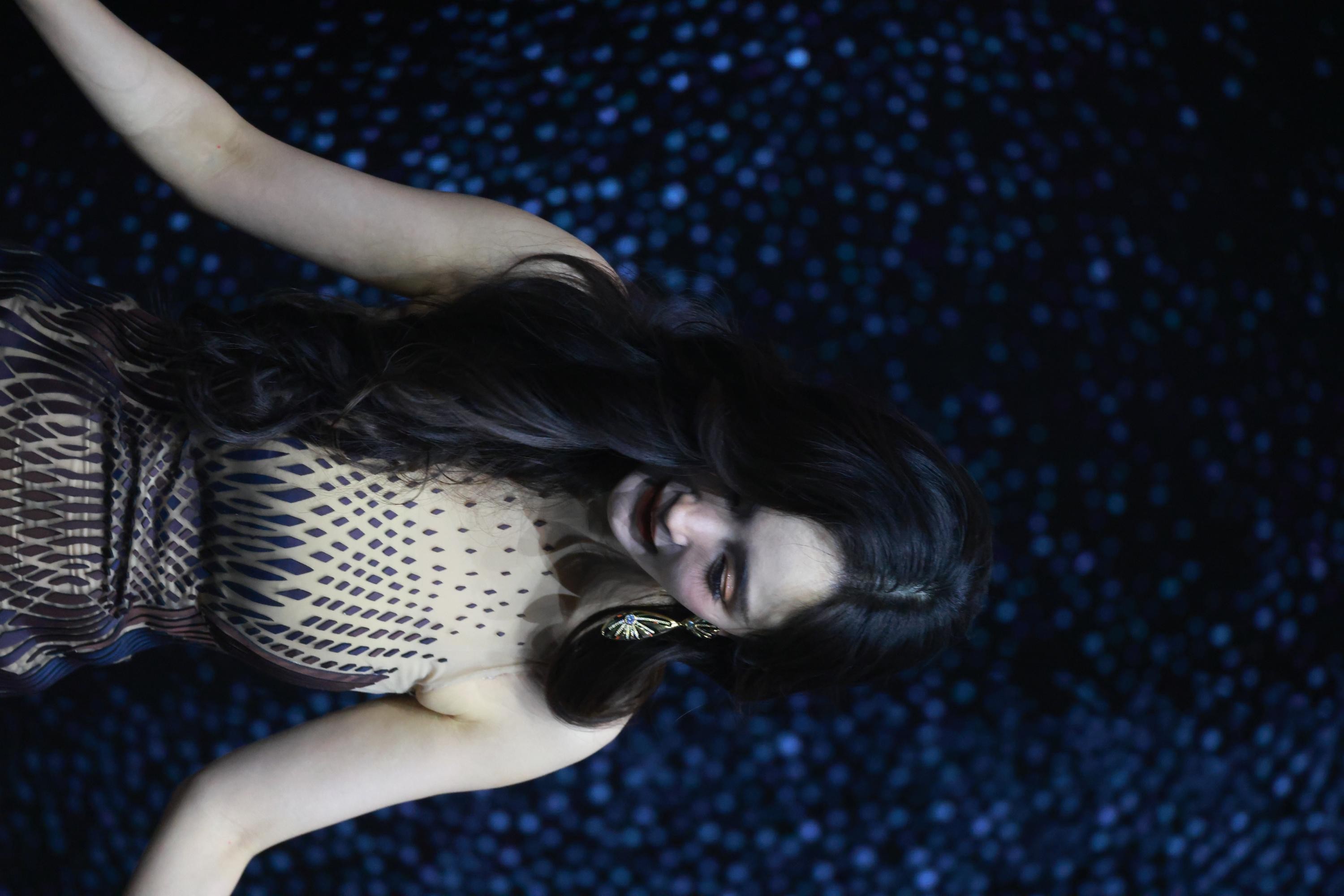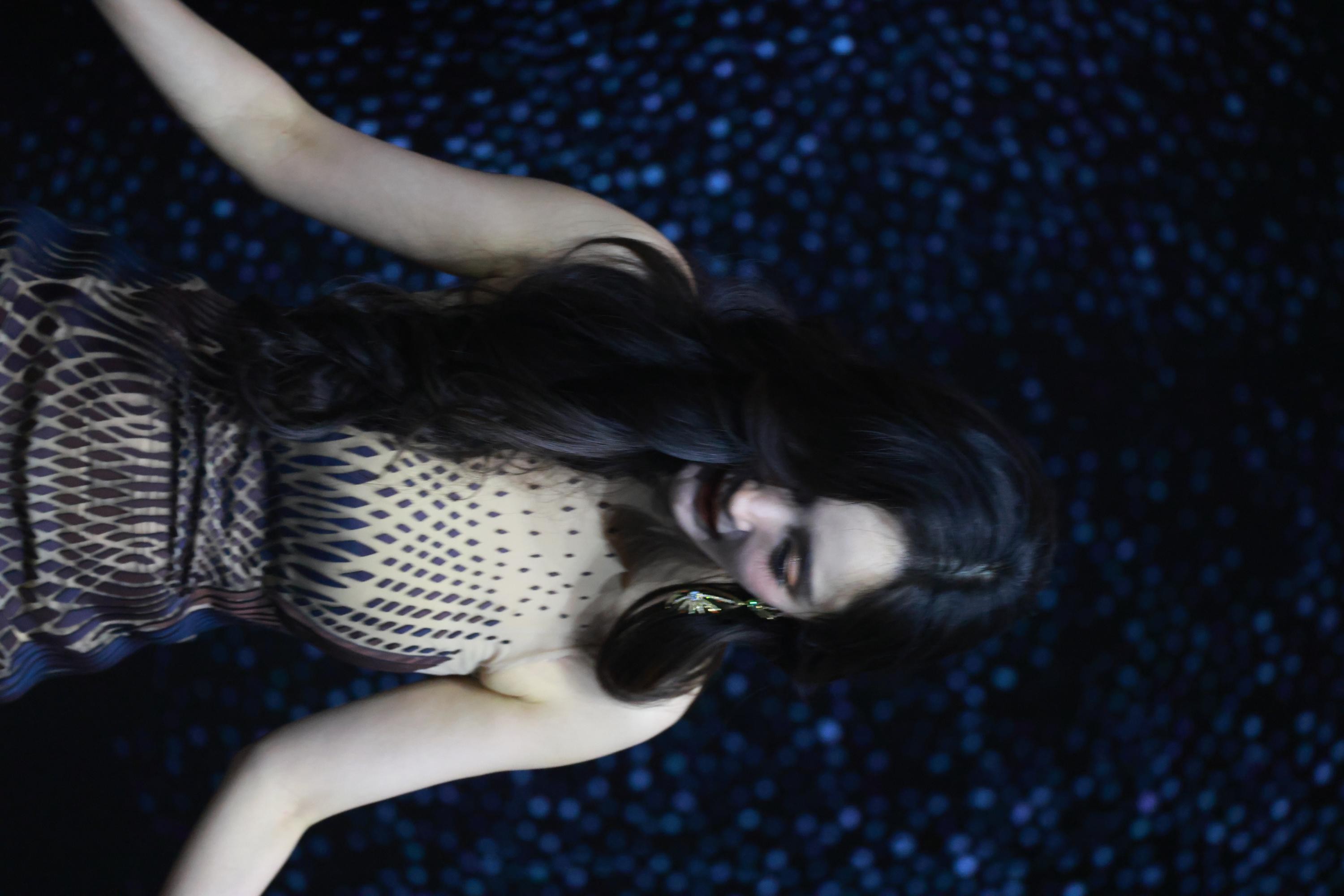 画面中,杨幂立于海天之间,身后是渐沉的夕阳与泛着金光的海面。她所穿的长裙,远看如同一层氤氲的薄雾,或是一抹被海浪冲上岸的月光,笼罩其身。这种通透而灵动的质感,打破了常规礼服的厚重感,与自然景观浑然一体。细观之下,裙身之上并非空无一物,而是密布着精巧的珍珠与碎钻刺绣,它们沿着身体的曲线蜿蜒排列,宛若退潮时沙滩上留下的泡沫痕迹,又似夜色中海水泛起的点点粼光。颈肩处的设计尤为精妙,珠饰在薄纱间微微凸起,在逆光中闪烁着柔和而神秘的光泽。