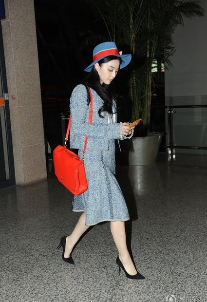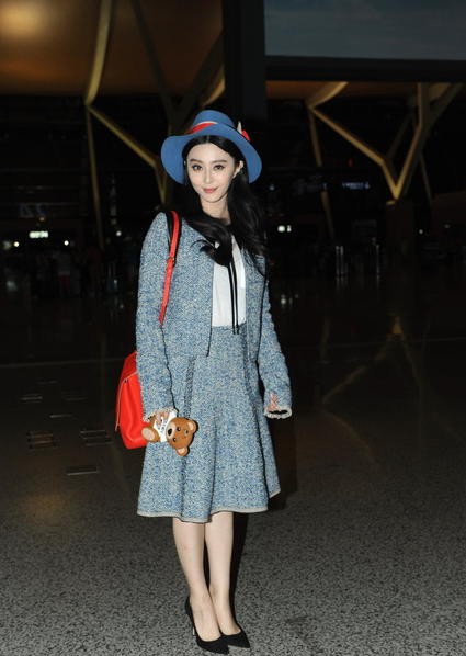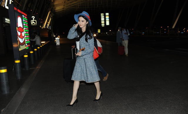 范冰冰灰蓝套装优雅现身机场 启程戛纳再现时尚影响力