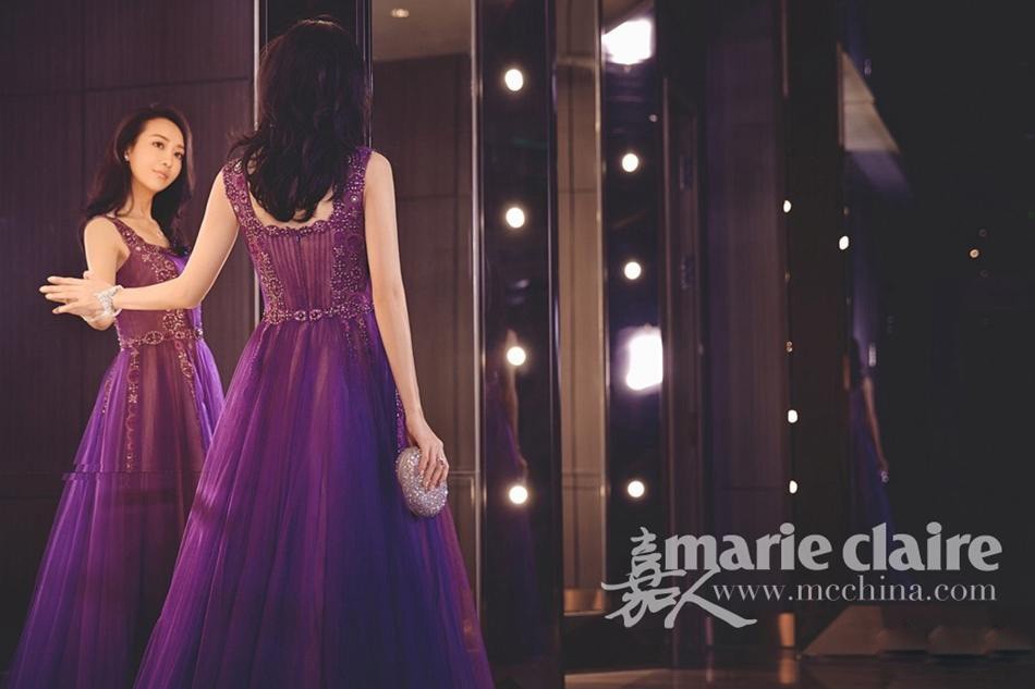 紫色,历来是高贵、神秘与浪漫的象征。在这组大片中,从深邃的茄紫到柔和的薰衣草色,不同层次的紫色成为叙事的基调。它衬托出王鸥肌肤的白皙透亮,也与她佩戴的华美珠宝形成了绝妙的呼应。丝绸与丝绒材质的礼服随着她的姿态流淌出细腻的光泽,仿佛将整个拍摄空间都染上了一层梦幻的滤镜。王鸥在镜头前的表现力收放自如,时而慵懒倚靠,眼神中带着一丝疏离与故事感;时而直面镜头,自信的气场透过画面直击人心。