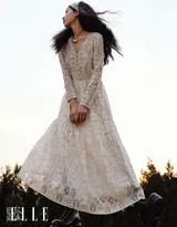 与之相辅相成的,是那一袭蕾丝长裙。蕾丝,以其通透、镂空与精致的纹理,成为了塑造朦胧美感与浪漫气息的最佳载体。它不像厚重的绸缎那样正式,也不似轻薄的纱料那样飘渺,而是介于遮掩与显露之间,形成一种迷人的“可见与不可见”的游戏。光线透过蕾丝的孔洞,在肌肤上投下斑驳摇曳的光影,与眼妆的偏光遥相呼应,共同构建出一种呼吸感十足的初夏氛围——既有温度,又不失清凉。