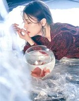 摄影师巧妙构建了一个液态的剧场。每一张影像都像被封装在无形的玻璃之后,光线经过“水体”的折射,在模特面部投下波光粼粼的斑纹。这种处理手法让人联想到透过鱼缸观察世界的视角——一切都被柔和化、慢速化,带着水特有的质感与温度。黎一萱的表情在镜头前呈现出多层次的解读空间:时而如鱼般空灵疏离,时而流露出人类特有的忧郁与渴望,这种双重性正是主题的核心隐喻。