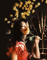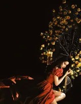 写真中,刘亦菲以多种造型亮相,每一套都承载着独特的情绪与叙事。最令人印象深刻的莫过于其与黄玫瑰的互动。她或怀抱一整棵姿态生动的黄玫瑰树,低垂的眼睫与娇嫩的花瓣形成一种静默而强大的对话,展现出一种别具韵味的“破碎美感”;或轻阖双眼,微微俯身靠近盛放的花朵,用嗅觉而非视觉去感知生命,那一刻的亲密与专注,让观者仿佛也能隔空嗅到一缕清香。网友们惊叹,这组写真让人不禁“梦回《玫瑰的故事》”,她与花的关系已超越了简单的衬托,达到了“人比花娇”、相映生辉的化境。